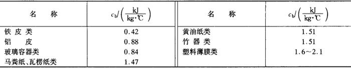 t1,t2——食品入库、出库时包装材料的温度,℃ Cb——包装材料和运载工具的比热容,kJ/(kg·℃),见表6-7-61 表6-7-61 包装材料或运载工具的比热容表
