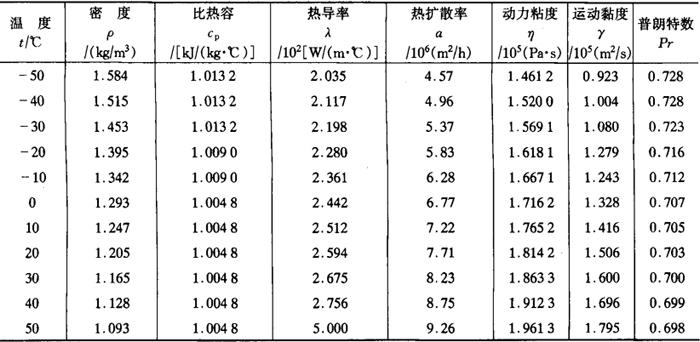 式中 Q3a——货物的通风换气耗冷量,W Q3b——操作人员的通风换气耗冷量,W n——每昼夜更换新鲜空气的次数,一般可采用2~3次 V——该库房的内净容积,m3 ρn——该库房的空气密度,kg/m3,见表6-7-63 表6-7-63 干空气在压力为101.325kPa时对传热有影响的物理参数