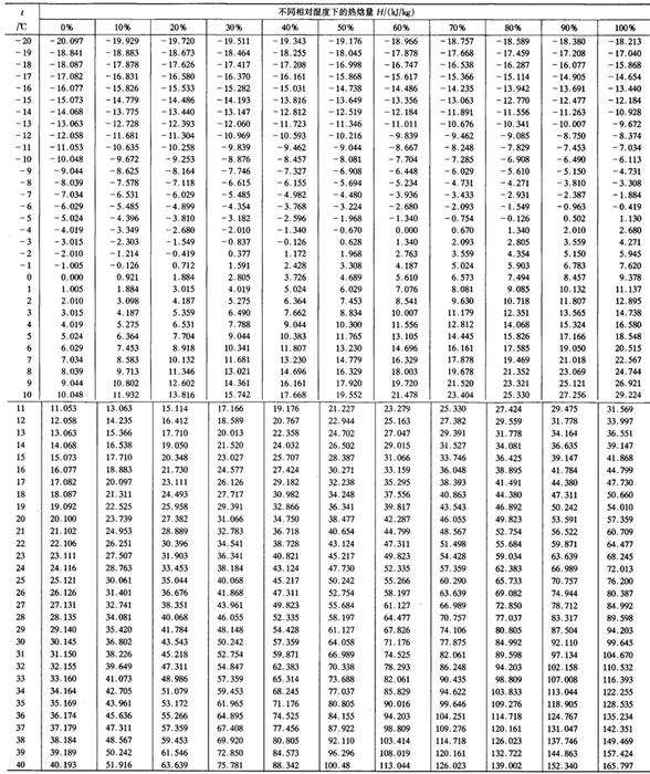 Hw,Hn—-库外、库内空气的热焓值,kJ/kg,见表6-7-64 表6-7-64 空气的热焓量H(-20~40℃,101.325kPa)