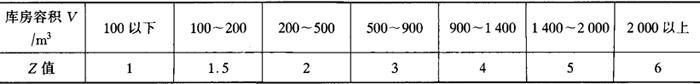 注:φw=60%。 Z——库房使用系数,即每天许可库门开启时间,h,见表6-7-66 表6-7-66 库房使用系数Z值