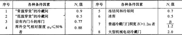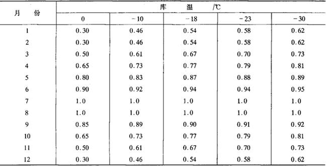 n——该库房内同期周期操作人员数 (2)制冷机的总负荷Qi 制冷机的负荷是选用整个冷库制冷机时所需的制冷能力,需要适应冷库全年生产的要求,特别是应能满足冷库生产高峰负荷的需要。 Qi=∑(mQ1+Q2+Q3+nQ4)R(W) 式中 Q1——围护结构传热而引起的耗冷量,是通过围护结构所传导的热量,W Q2——食品含热的耗冷量,即冷却、冻结、再冻结和贮存食品时其本身在冷加工过程中的耗冷量,W Q3——库房内通风、换气耗冷量,为库房在贮存某些食品进行新鲜空气更换时及生产车间进行空气调节时由新鲜空气带入热量而引起的耗冷量,W Q4——操作管理的耗冷量,指在库房内的电动机,照明用灯发出的热能和库门开启、操作工人、操作设备产生的热量而引起的耗冷量,W m——为Q1的修正系数,见表6-7-69 表6-7-69 围护结构耗冷量(Q1)的修正系数m