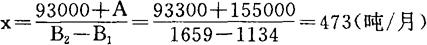 因为由计算得到η=41%>30%,所以可以认为在目前市场状态下,这个厂的经营状态是安全的。 三、1983年度计划的预测 上级下达该厂1983年的利润指标为112万元,为了达到这个指标,1983年聚氯乙烯树指的产量和销售量的计划安排,也可以用盈亏临界分析法测算。 因为全年利润指标为112万元,则每月平无要完成利润指标为 ⊿y=y2-y1 即B2x-(A+B1x)=93300(元)