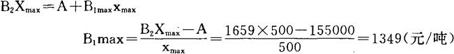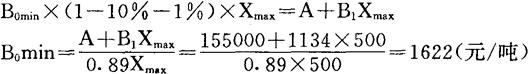 表明当能源价格上调,产品变动成本达到1349(元/吨)以上时,即使现有生产装置满负荷生产,全厂仍将发生亏损。 若变动成本基本不变,而销售价格下降,也可用盈亏临界法来预测保持全厂不发生亏损损的最低销售价B0min。 即由y1=y2导出关系式:
