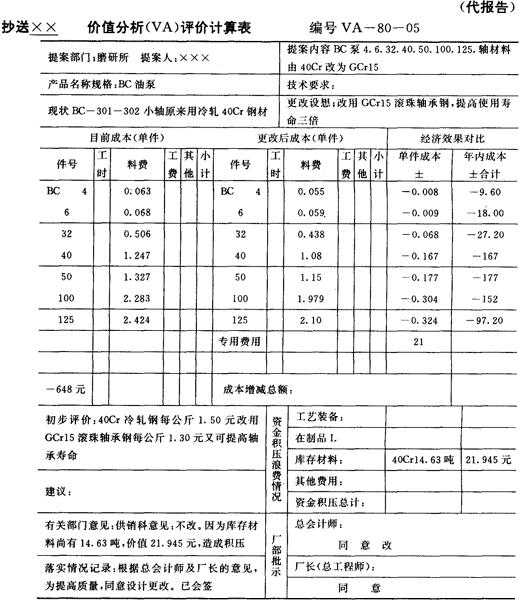 *背面附试验报告 以前,该厂在新产品的试制及老产品正常生产的过程中,常常发生更改图纸,或更改工艺的现象,设计人员缺乏经济概念,想改就改,往往造成物资的浪费和积压,有关部门很有意见。因此,有关设计人员开出的更改建议单,常常会发生长途旅行的怪事。有时产品已装上箱板准备装箱,更改单还没有下来,使产品不能出厂,弄得部门之间关系紧张,工作效率低,事情闹到厂部,“公说公有理、婆说婆有理”,弄得领导也难以解决。 试行此表后情况大有改善。其原因: (1)全厂每个部门、每个职工,均可以根据自己的经验和了解到的情况,填写此表,提出合理化建议,这样有利于挖掘最大的潜力; (2)提案人提出的方案,经财会等部门经济核算后,经济效果明确,新旧方案可比性强,有说服力; (3)各部门涉及的问题,都可畅所欲言,一切以数据说话,克服了扯皮现象,有利于团结; (4)方法具体,目标明确,领导决策有依据,工作效率大有提高; (5)为进一步对产品作价值分析提供了可靠的依据。 |