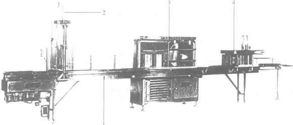 图3-5-24 火腿成型过程中的部分设备 1-输送机 2-塑料袋翻提机 3-真空封口机 4-加盖装置 |