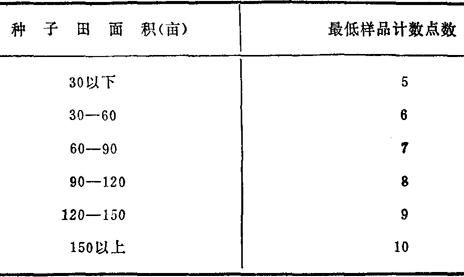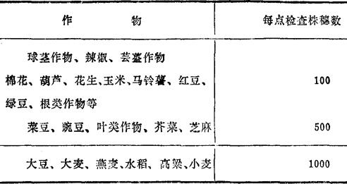如果第一次计数时,各项指标没有达到规定的标准,那末应进行第二次计数。如果某项百分率不超过容许差距的一倍,则可求两次平均值。 如果种子田种植二个以上亲本,则应分开测定。 (2)每点检查株数 每点检查株数因作物种类而不同(见表5-4)。 表5-4 每点计数的株穗数