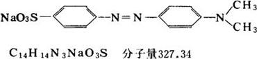 特性:橙黄色的鳞状晶体或粉末。稍溶于水而呈黄色,不溶于乙醇。用作pH值指示剂,变色范围3.1~4.4,由红色变黄色。也用作酸碱滴定指示剂。