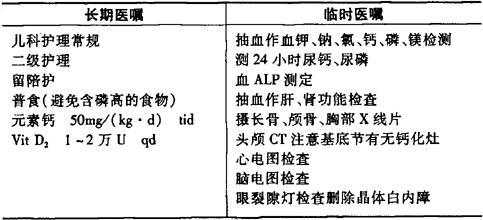 说明:1.单用钙剂无效者加用Vit D,并依病情调整用量以维持血钙在2.13~2.38mmol/L,注意监测血钙,避免高钙引起肾脏损伤。 2.降低血磷,可口服蒙脱石、氢氧化铝凝胶。 3.血镁浓度<0.6mmol/L时,可肌内注射50%硫酸镁0.1~0.2ml/(kg·次)。 4.甲状旁腺移植。 |