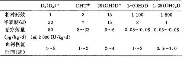 注 *药效有蓄积作用;★二氢速固醇高度推荐;△疗效可疑 (4)治疗中监护下列指标 血钙>2.5mmol/L(10mg%)或尿钙24h>4mg/kg,应停服钙剂及维生素D,防高钙血症。血钙宜维持在2.13~2.38mmol/L(8.5~9.5mg%)。维生素D剂量宜从小剂量开始,应根据血、尿钙浓度调整剂量。 |