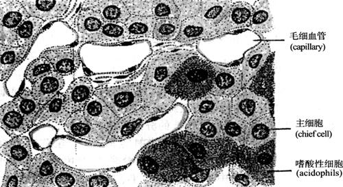 图15-12 甲状旁腺组织结构 (1)主细胞(chief cell)为圆形或多边形,体积小,核圆居中,细胞质少,染色浅,呈弱嗜酸性。主细胞的功能是合成甲状旁腺素(parathyroid hormone,PTH)。 (2)嗜酸性细胞(oxyphilic cell)体积较主细胞大,为多边形,核染色深,胞质含嗜酸性颗粒,故呈强嗜酸性。此细胞数目较少,但随年龄增大数目有所增加,常单个或成群分布,此细胞功能意义还不是很明确。 |