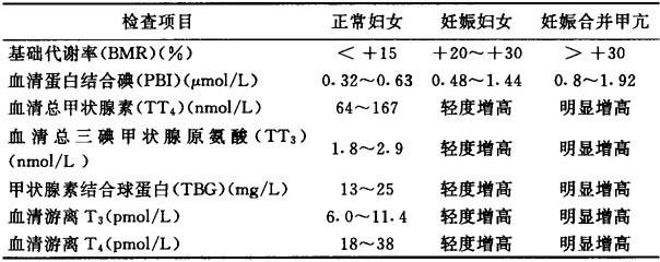 | 释义 | 甲状腺功能亢进 甲状腺功能亢进是一种常见的内分泌疾病。合并妊娠者的发生率为0.02%~0.1%,属于高危妊娠。妊娠对甲亢的影响并不大,然由于妊娠本身加重心脏负担,易促使严重甲亢患者的心血管系统症状加重,甚至出现心力衰竭或甲亢危象。反之,甲亢对妊娠则有一定的影响:妊娠期间服用抗甲状腺药物,如他巴唑、丙基硫氧嘧啶,这些药物会通过胎盘,可使胎儿产生先天性甲状腺功能减退;流产、早产、死胎的发生率高于正常妊娠。妊高征发生率亦有显着增高。 【诊断】 1.临床表现 (1)症状 1)妊娠前原有甲亢病史,起病可急可缓,也可突然发作,进展迅速并出现甲状腺危象。 2)有心悸、心动过速、畏热多汗、神经过敏、精神衰弱、食欲亢进但消瘦、无力疲乏、手指震颤、腹泻等。 (2)体征 1)心率及脉率加快。 2)甲状腺肿大伴有血管杂音,触到震颤。 3)突眼。 4)手指震颤。 5)房颤、心衰、收缩压增高、舒张压变化不大使脉压增大。 2.辅助检查 (1)实验室检查 妊娠时由于内分泌的改变,即使甲状腺功能正常的孕妇,其基础代谢率可比非孕妇高20%~30%,故各项实验室检查的标准应有相应提高,见表2.5.4。 表2.5.4 妊娠时孕妇甲状腺功能的改变