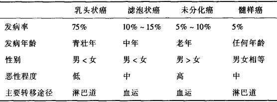 | 释义 | 甲状腺癌 甲状腺癌是头颈部较常见的恶性肿瘤,占全身恶性肿瘤的1.5%左右,以女性发病较多,男女之比为1∶2.5左右,较多发生于40岁左右的青壮年。低度恶性的甲状腺癌有时可自然生存10年以上,有的甚至有肺部转移还能带瘤生存5年左右,但高度恶性的甲状腺癌患者可在短期内死亡。 【病理分类及诊断要点】 1.乳头状癌:是甲状腺癌中最常见的一种,常见于中青年妇女。病灶一般为单发,大小不等,恶性程度低。病变发展缓慢,病程较长,临床表现为甲状腺单发结节,质硬,表面不平,较固定。其播散途径主要是淋巴道,以同侧颈内静脉周围淋巴结转移最为多见,淋巴结转移率为50%~70%,也可进一步转移至颈后三角或向下至纵隔淋巴结。预后较好。 2.滤泡状癌:多见于40~60岁的中老年妇女。原发病灶一般为单个,大小不一,呈圆形、椭圆形或结节状,恶性程度中等。病程较长,生长缓慢,肿瘤边界清楚,有包膜,与腺瘤相似。其播散途径主要以血运转移为主,可很早转移至肺、骨和肝。淋巴道转移较乳头状癌少,其颈淋巴结转移率约为22%。其预后不如乳头状癌好。 3.未分化癌:多见于老年人,以男性为多,是一高度恶性的癌肿。表现为颈前区肿块,质硬固定、不规则、边界不清,生长迅速,在短期内可侵及周围组织,可出现吞咽困难、呼吸不畅、声音嘶哑和耳后区疼痛,局部可有触痛,双侧颈淋巴结肿大。血运转移也较常见。预后很差。 4.髓样癌:是一种来自甲状腺滤泡旁细胞的癌肿,肿瘤无包膜,大小不一,一般为单结节,偶有多发结节,质硬而固定。其恶性程度中等。可发生于任何年龄。约10%有家族史。临床除有甲状腺肿块和颈淋巴结肿大外,约1/3有慢性腹泻,并伴有面部潮红等类似类癌综合征的症状。临床如发现有阵发性高血压和高血钙等症状,应考虑有此病的可能。 表13-2 4种甲状腺癌的生物学特征