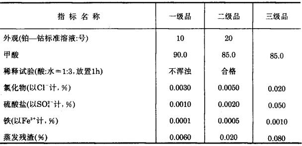 【物化性状】 (1)无色透明液体,有刺激性气味。相对密度1.220(20℃),沸点100.5℃,熔点8.4℃,闪点(1)59℃,自然点485℃,腐蚀性很强。为一元羧酸中酸性最强的酸。 (2)能与水、醇、醚及甘油等按任何比例混合。 【产品质量标准】 GB 2093-80