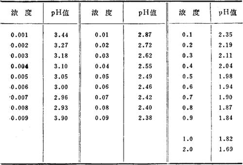 蚁酸浓度(mol/L)与pH值对照表