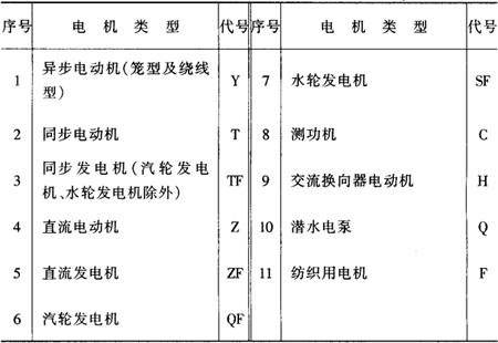 产品型号中的分隔号“-”,在产品代号、规格代号、特殊环境代号和补充代号的数字和字母之间,不会引起混淆时,可省去不用。 电机的产品代号由类型代号、特点代号、设计序号和励磁方式代号等4个小节顺序组成。 电机类型代号系表征电机的各种类型而采用的汉语拼音字母,详见表2-1的规定。 表2-1 电机类型代号