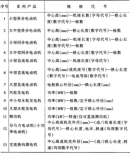 特点代号系表征电机的性能、结构或用途而采用的汉语拼音字母。对于防爆电机,代表防爆类型的字母A(增安型)、B(隔爆型)、ZY(增压型)应标于电机特点代号首位,即紧接在电机类型代号后面标注。 设计序号系指电机产品设计的顺序,用阿拉伯数字表示。对于第一次设计的产品,不标注设计序号,从基本系列派生的产品,其设计序号按基本系列标注;专用系列产品则按本身设计的顺序标注。 励磁方式代号分别用字母S表示谐波励磁、J表示晶体管励磁、X表示相复励磁,并应标注在设计序号之后。当不必标注设计序号时,则标于特点代号之后,并用“-”分开。 电机的规格代号用中心高、铁心外径、机座号、机壳外径、轴伸直径、凸缘代号、机座长度、铁心长度、功率、电流等级、转速或极数等参数中的几个参数来表示。主要系列产品的规格代号按表2-2的规定。机座长度采用国际通用字母符号来表示,S表示短机座,M表示中机座,L表示长机座。铁心长度按短至长顺序用数字1,2,3…表示。凸缘代号采用国际通用字母符号FF(凸缘上带通孔)或FT(凸缘上带螺孔)连同凸缘固定孔中心基圆直径的数值来表示。 表2-2 主要系列产品的规格代号