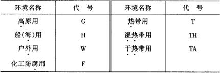 注:关于大中小交流电机(同步电机和异步电动机)的划分:中小型交流电机,即中心高为630mm及以下或定子铁心外径为990mm及以下的电机;大型交流电机,即定子铁心外径为990mm以上的电机。 电机的特殊环境代号按表2-3的规定选用,如同时适用于一个以上的特殊环境时,则按表中的顺序排列。 表2-3 特殊环境代号
