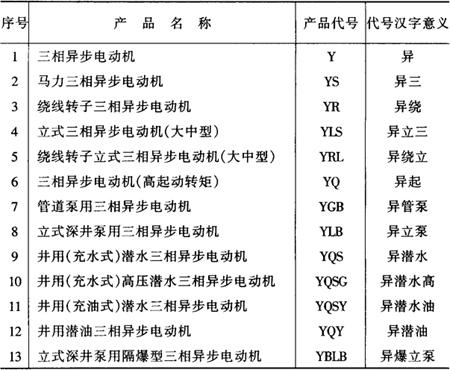 补充代号用汉语拼音字母或阿拉伯数字表示。采用大写字母,应不与表2-1所采用的字母重复。补充代号所代表的内容,应在产品标准中规定。 常用异步电动机产品代号见表2-4。 表2-4 常用异步电动机产品代号