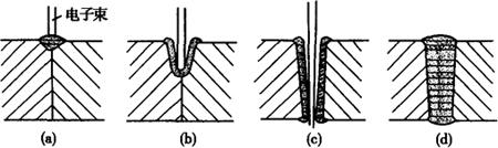 图6-9 电子束焊焊缝形成原理图 (a)接头局部熔化、蒸发;(b)金属蒸气排开液体金属、电子束“钻入”母材;(c)电子束穿透工件,小孔由液态金属包围;(d)电子束后方形成焊缝 电子束焊具有以下优点:①电子束穿透能力强,焊缝深宽比大。目前,电子束焊缝的深宽比可达到50∶1,焊接厚板时可以不开坡口实现单道焊,比电弧焊可以节省辅助材料和能源的消耗。②焊接速度快,热影响区小,焊接变形小。对精加工的工件可用作最后连接工序,焊后工件仍保护足够高的精度。③真空电子束焊接不仅可以防止熔化金属受到氧、氮等有害气体的污染,而且有利于焊缝金属的除气和净化,因而特别适于活泼金属的焊接。也常用电子束焊接真空密封元件,焊后元件内部保持在真空状态。④电子束在真空中可以传到较远的位置上进行焊接,因而也可以焊接难以接近部位的接缝。⑤通过控制电子束的偏移,可以实现复杂接缝的自动焊接。可以通过电子束扫描熔池来消除缺陷,提高接头质量。 电子束焊的缺点是:①设备比较复杂,费用比较昂贵。②焊接前对接头加工、装配要求严格,以保证接头位置准确、间隙小而且均匀。③真空电子束焊接时,被焊工件尺寸和形状常常受到工作室的限制。④电子束易受杂散电磁场的干扰,影响焊接质量。⑤电子束焊接时产生的X射线需要严加防护,以保证操作人员的健康和安全。 电子束焊的分类很多,一般按被焊工件所处的环境的真空度分为三种:①高真空(10-4~10-1Pa)电子束焊,其特点是保护好,应用于质量要求较高的工件。②低真空(10-1~10Pa)电子束焊,特点兼顾了质量与效率两个方面。③非真空电子束焊,电子束射到大气压力下工件上,由于散射作用,焊缝的深宽比只能达5∶1。 电子束焊设备通常是由电子枪、工作室(真空室)、真空系统、电源及电气控制系统等部分。电子束焊接头质量的影响因素很多,除了电子束电流、电子束功率、焊接速度、电子束偏转距离,焦点直径等外,焊前的准备也很重要,如接头的设计、焊件装配的精确度都对接头质量有很大的影响。不锈钢采用电子束焊时,由于焊接速度快,熔池的冷却速度也快,可以防止碳化物析出,从而提高接头的耐蚀能力。 |