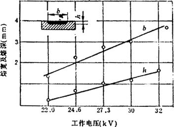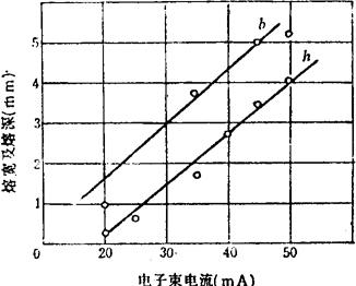图6-24 Ub对焊缝成形的影响 (2)焊接电流(电子束电流)Ib:其Ib对焊缝成形影响的程度随材料不同而异。图6-25是焊接不锈钢时的测试结果。Ub为25kV时,Ib从20mA增至50mA,熔深从0.25mm增至4mm,增加了15倍,熔宽也增加了3倍多。