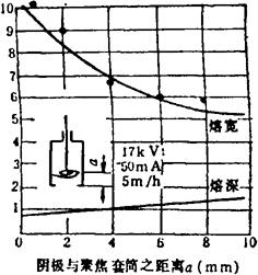 图6-27 焊速Vb对焊缝成形的影响 (5)电子束焦点直径:其他参数固定时,焦点直径取决于阴极与聚焦透镜套筒之间的距离a。a增大,焦点直径减小,熔宽减小,熔深变化不大。因此可以在保持熔深基本不变的情况下,在较大范围内调节熔宽。图6-28是焦点直径对焊缝成形的影响趋势。