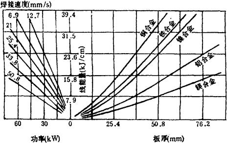 6-28 焦点直径对焊缝成形的影响 以上规律对于较低的加速电压比较明显。为了进一步测试高压电子束焊接时Ib、Vb对焊缝成形的影响规律,在1kW高压电子束焊机上,对6.3mm真空熔炼锆合金-2号进行焊接实验。实验结果表明:①高电压时,焊接速度不变,提高Ib、Ub均使熔深h增加。②当Ub一定时,存在一电流Ib的临界值。即在此电流值时,获得最大熔深,并且耗能最小。Ib临界值数值与使用的Ub有关,Ub提高,Ib临界值增大,反之亦然。③焊接速度Vb、焊接电流Ib均固定时,提高加速电压Ub,使h/b增大。 2.工艺参数的选择 (1)利用线能量与焊件厚度的关系图6-29,根据不同材料的厚度,查出所需的线能量数值。选定一个焊接速度,在图的左下方查出一个所需功率。根据焊机情况选定一个加速电压。根据功率等于Ub·Ib关系确定Ib。用上述方法确定了Ib、Ub、Vb大致范围之后,通过实验调节,最终确定具体规范。 线能量q的计算公式为:q=60UbIb/Vb(J/cm),式中Ub、Ib、Vb分别为加速电压V,电子束电流(A),焊接速度(cm/min)。
