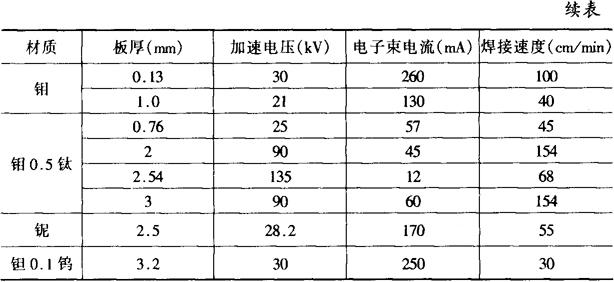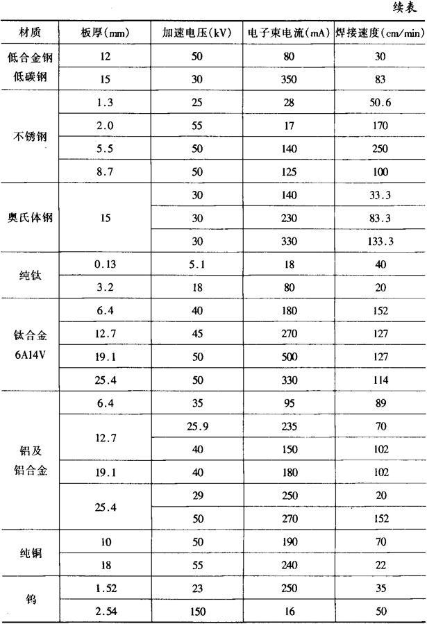 图6-29 线能量与材料厚度的关系 (2)查表法:根据材料种类和厚度在表6-13中选择一近似规范,在此基础上进行调试,确定使用的具体规范。 表6-13 常用材料电子束焊规范参数