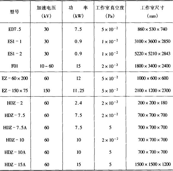 图6-37 电子束焊机的组成简图 (a)150kW、40mA标准机型 (b)大功率机型(可焊250mm碳钢) 2.国产电子束焊机型号及技术数据 表6-17 国产电子束焊机型号及技术数据