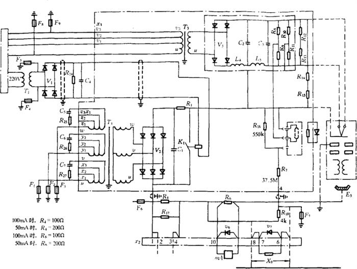 图6-40 分段串联高压整流电路的接线方式 4.电子束流稳定电路 为使电子束流在电源电压波动时,能够稳定工作,采用了图6-41所示的电路。这种电子轰击预热阴极的电子枪电路,可以保证电源电压波动±15%时,轰击电流波动±0.5%,电子束流波动在10~100μA之间,反应时间小于0.1s。
