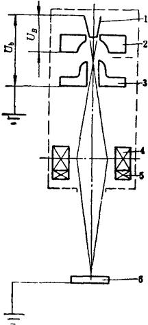 图6-41 电子轰击预热阴极电子枪电路 稳定电子束流的工作原理:当电源电压降低时,由D6~D9整流器输出电压降低,使BG1的Iec增加,使BG2导通提前,使KP10,KP11的导通角加大,使灯丝1中的电流增加,使灯丝发射电子能力稳定,保证了灯丝1和阴极2之间的轰击电流维持稳定。反之电源电压提高时,KP1。,KP11的导通角相应减小,使灯丝1的加热电流维持不变,使灯丝发射电子能力维持不变,轰击电流仍维持不变。这就自动补偿了电源电压波动对电子束流的影响,使焊接功率不致因电源电压波动引起明显变化。 5.电子束焊枪 电子束焊枪是产生电子束的关键部件。按结构不同分为二极枪和三极枪两类。图6-22中的电子束产生部分,就是二极枪的示意结构图。它由阴极10、聚束极9和阳极8组成,聚束极与阴极等电位。在一定的加速电压下,通过调节阴极温度、改变阴极发射电子流数值,控制电子束流的大小。三极枪的结构如图6-42所示。由阴极1、偏压极2、阳极3组成电极系统。阳极和阴极之间的电位差即加速电压Ub。偏压极相对于阴极呈负电位。改变偏压极的位置、形状及负电位的大小,可以控制电子束流的大小和形状。