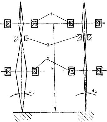 图6-43 双聚焦线圈的电子枪示意图 1-第一聚焦 2-第二聚焦 3-光阑 s-工作距离 α-会聚角 |