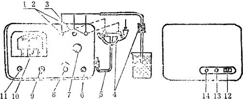 图2-22 DDS-11型电导仪示意图 1、2.电极接线柱 3.260型电极屏蔽线接线柱 4.电极 5.U型电极固定架 6.校正、测量换档开关 7.范围选择器 8.校正调节器 9。电流开关 10.指示电表 11.指示灯 12.三芯电源插孔 13.熔丝 14.三芯记录器插孔 3.将范围选择器(7)扳到所需要的测量范围。如不知被测量的大小,应先把它放在最大量程位置,以防过载使表针迅速转动而打弯,然后逐档下降。 4.连接电极引线。 (1)若被测溶液的电导很低(在5μS以下)或者其电阻很高(在200kΩ以上),例如蒸馏水或极淡的溶液,使用260型光亮电极。将电极引线端接至主机右上端接线柱上,电极的金属隔离线接中间的接线柱上,再把电极浸入欲测溶液中(液体盛器的表面须擦干)。 (2)若被测溶液的电导在150mS以下5mS以上(即电阻大于6.67Ω小于200kΩ)用260型铂黑电极(铂片镀上了铂黑),其连接法同(1)。 (3)若被测溶液的电导很高(大于150mS,但小于500mS)或者其电阻很小(小于6.67Ω,但大于2Q),则用U型电极,而范围选择器7放在第11档(150mS一档),把电极固定在主机右侧的夹架上,再把被测溶液从喇叭口倒进至浸没铂片,而其两根引线接在1、2接线柱上,把所得读数乘以U型电极的常数即为被测量的大小。 5.将开关板向“校正”,调整“调节器”(8),使指针停在倒立三角形处。(必须在电极接线柱与电导池接妥的情况下进行校正)。 6.将开关6板向“测量”,这时,将读数乘以选择开关7上的信率即为被测溶液的电导。例如,选择器7放在50μS档,指示是3.5则被测量值应为35μS-;又如,它在1.5μS档,指示是12,则被测量值是1.2μS。 7.用1.5μS、15μS、150μS、1.5mS、15mS、 8.为保证读数精确,应尽可能使表针指示近于满度。例如,被测量是4.5μS,应使选择器7放在5μS档,而不宜放在15μS档。 9.在使用过程中要经常检查“校正调节”是否准确,即开关6板向“校正”时,指针是否仍停留在倒立三角形处。尤其对高电导进行测量时,每次应在校正后读数,以提高测量精度。 10.测量待测液的温度。 11.取出电极,用蒸馏水冲洗干净,用滤纸吸干。 |