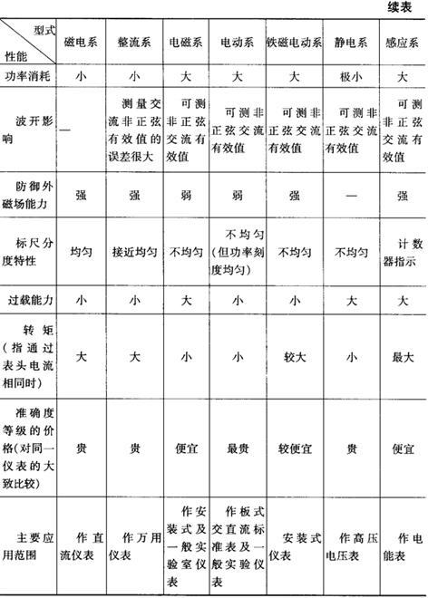 | 释义 | 电工仪表的选择、使用与维护 1.电工仪表的合理选择 合理选择电工仪表就是在保证测量要求的前提下,确定仪表的类型、准确度等级和量程等。 (1)仪表类型的选择:可参照7.1.1仪表分类。例如测量直流电量时,可广泛采用磁电系仪表和整流系仪表;测量正弦交流电量时常采用电磁系、电动系仪表,以便测量其有效值;测量非正弦交流电量时,用电磁系或电动系仪表测量其有效值,而用整流系仪表测量其平均值。 (2)仪表准确度的选择:从提高测量精度的角度来看,测量仪表的准确度等级越高越好,但仪表的准确度越高,对外界使用条件的要求就高,价格也高。因此,仪表准确度等级的选择,应从测量的实际要求出发,既要保证测量精度的要求,又要考虑其经济性,不可过分追求仪表的高准确度。通常将0.1、0.2级及以上仪表作为标准仪表用来精密测量,0.5级和1.0级作为实验室进行检修和试验用的测量仪表,1.5级及以下仪表作为一般工程的测量及作为安装式仪表使用。 与仪表配合使用的扩大量程的附加装置(如分流器、附加电阻器、电流和电压互感器等),其准确度等级要比仪表本身的准确度等级高1~3级,才能把测量误差限制在允许的范围以内。 (3)仪表量程的选择:只有在量程选得合理的情况下,仪表的准确度才能发挥其作用。仪表的量程必须大于或等于被测电量的最高值,被测量的指示范围应在标度尺满标度的20%~100%以内,才能保证达到该仪表的准确度。一般把被测电量指示范围选择在仪表标度尺满标度的后1/3(甚至后1/4)段,以充分利用仪表的准确度。在一般情况下,指针越接近标度尺的上限,测量误差就越小。 (4)仪表内阻的选择:仪表内阻要根据被测对象阻抗的大小来选择,否则会产生很大的测量误差。仪表内阻的大小,反映仪表本身的功耗。为使仪表接入被测电路后,不致影响电路原来的工作状态及减少仪表的功耗,要求电压表内阻及功率表电压线圈的电阻尽量大,且量程越高,内阻越大;要求电流表内阻及功率表电流线圈的电阻尽量小,且量程越高,内阻越小。 (5)仪表工作条件的选择:选择仪表时,要考虑使用仪表时的环境条件和工作条件。例如在实验室使用或安装在开关板上使用,因条件不同,故对仪表的要求就不同。在使用仪表过程中,周围的环境温度、湿度、机械震动、外界电磁场强弱等因素,都必须周密考虑。 (6)仪表绝缘强度的选择:应根据被测电量及电路电压的高低,来选择仪表及其附加装置的绝缘强度,以防测量时损坏仪表,甚至发生人身事故。 上面叙述了电工仪表选择的一般原则。为了便于了解常用各类仪表的性能,正确选用仪表,现将各种电工指示仪表的性能列于表7-2中,供选择仪表时参考。 表7-2 各种电工指示仪表性能比较