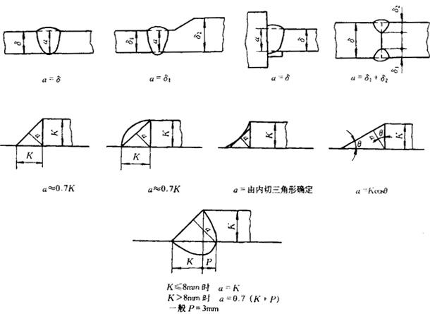 | 释义 | 电弧焊接头静载强度计算公式 在静载条件下,当焊缝金属和母材都具有较好塑性时,作如下假定: 1)焊接残余应力对接头强度没有影响。 2)由于几何不连续引起的局部应力集中,对接头强度没有影响。 3)以焊缝中最小的断面为计算断面。图13-36为各种接头的焊缝计算断面,图中a为该断面的计算厚度。