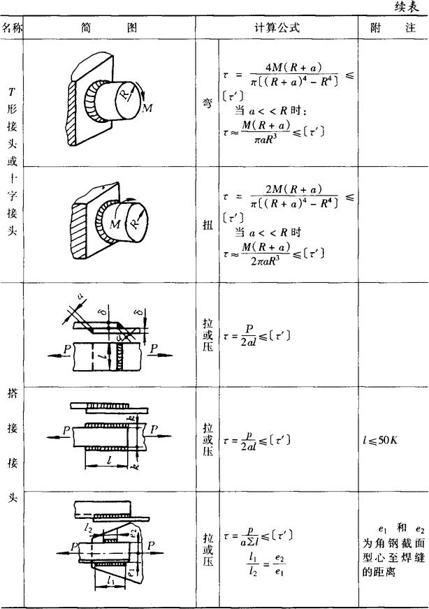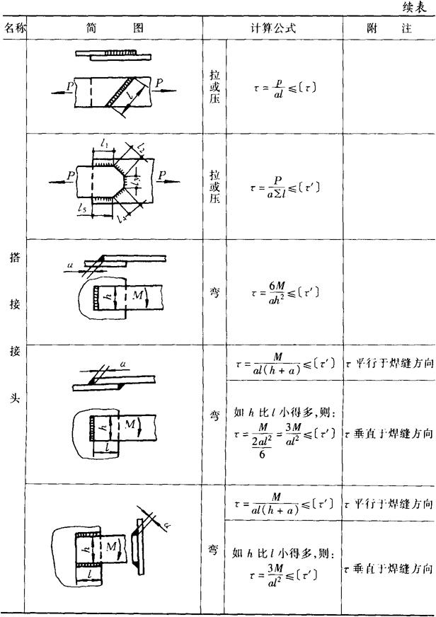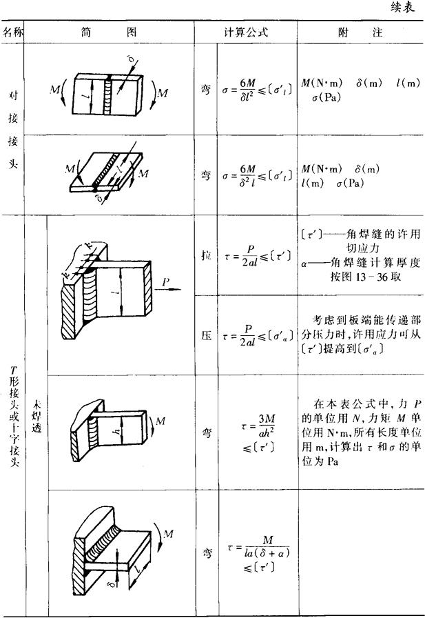 图13-36 各种焊缝的计算断面(a为计算厚度) 4)认为角焊缝都是在切应力作用下破坏,一律按切应力计算其强度。 5)正面角焊缝和侧面角焊缝在强度上无差别。 在上述假设条件下,得出常用的电弧焊接头静载强度计算公式,见表13-7。 表13-7 电弧焊接头静载强度简易计算公式