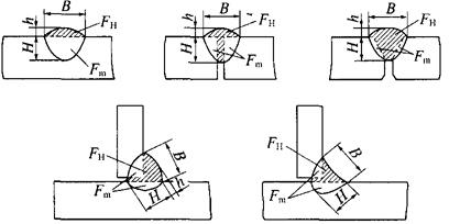 H-熔深;B-熔宽;h-余高;Fm-母材熔化部分的横截面积;FH-熔敷金属在焊缝横截面上所占面积