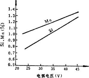 图4-14是在其他条件相同的情况下,改变电弧电压,焊缝金属中硅和锰含量的变化情况。