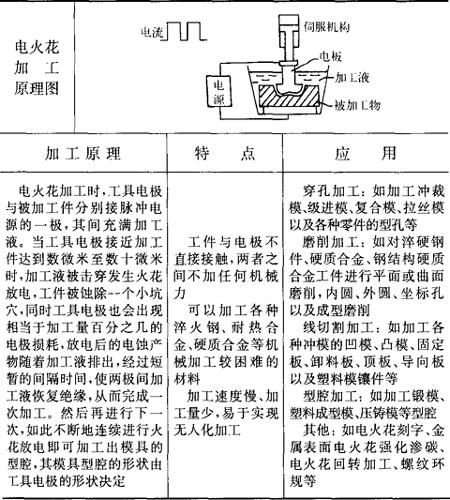 | 释义 | 电火花加工 (一)电火花加工原理、特点及应用(表7.4-1) 表7.4-1 电火花加工原理、特点及应用