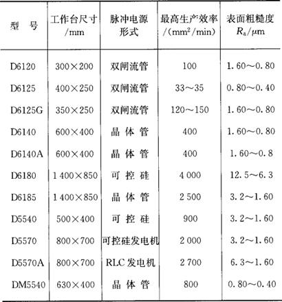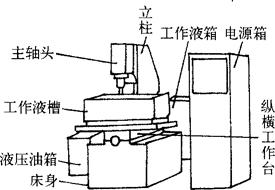图7.4-1 电火花加工机床 电火花加工机床由机械部分(包括床身、立柱、纵横工作台、主轴头等);电源箱(内有脉冲电源、电极自动跟踪系统、操作部分);工作液循环处理系统组成。其中电源箱中的脉冲电源是连续产生火花放电的能源,它对加工速度、表面粗糙度、工具电极损耗等都有很大影响。电极自动跟踪系统是保证两极间一定的放电距离,同时检测出两极间电压或电流的变化,并采用伺服电机或液压驱动的液压伺服机构,使电极的主轴头上下进行调节运动。操作部分是通过控制面板上各种按钮操作,实现加工过程的自动化控制或CNC控制。工作液循环处理系统是用来净化工作液的循环过滤装置,它包括工作液箱、工作液槽、液压油箱等。 电火花加工机床技术规格见表7.4-2。 表7.4-2 电火花加工机床技术规格