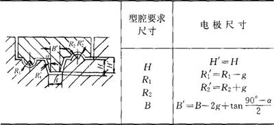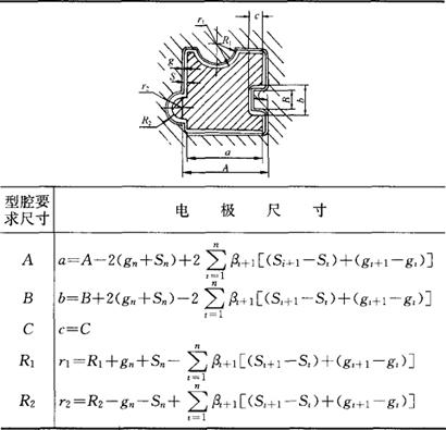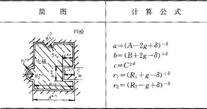 注:型腔加工用电极横断面尺寸,确定方法与穿孔加工电极一样,但应考虑精加工和抛光余量。g为放电间隙。 表7.4-9 有损耗加工时采用平动头加工电极横断面尺寸计算