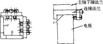 (c)合理的拼合 图7.4-2 石墨电极方向性和拼合方法 (四)电极和工件的装夹与定位 较大的电极可用主轴下端的连接法兰上a、b、c三面作基准,直接装夹,见图7.4-3。较小的电极可利用电极夹具装夹,见图7.4-4。组合电极也可用通用电极夹具装夹,如图7.4-5所示。