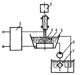 图3-1 电火花加工机床示意图 1—脉冲电源;2—伺服系统;3—工具电极;4—工件;5—工作液;6—泵;7—过滤器 工件4与工具电极3分别接脉冲电源1的两个输出端.伺服系统2使工具电极和工件间经常保持一个很小的放电间隙.电极的表面(微观)是凹凸不平的,当脉冲电压加到两极(工具和工件)上时,当时条件下某一相对间隙最小处或绝缘强度最低处的工作液(绝缘介质)将最先被电离为负电子和正离子而被击穿,形成放电通道,电流随即剧增,在该局部产生火花放电,瞬时高温使工件和工具表面都蚀除掉一小部分金属,单个脉冲经过上述过程,完成了一次脉冲放电,而在工件表面留下一个带有凸边的小凹穴,这样以很高频率连续不断地重复放电,工具电极不断地向工件进给,就可将工具的形状复制在工件上,加工出所需要的零件. 脉冲放电现象应用于“尺寸加工”,应具备如下条件. (1)工具电极和工件之间必须维持合理的距离,即相应于脉冲电压和相应于介质的绝缘强度的距离.在该距离范围内,既可以满足脉冲电压不断击穿介质,产生火花放电,又可以适应在火花通道熄灭后介质消电离以及排出蚀除产物的要求.若两极距离过大,则脉冲电压不能击穿介质,不能产生火花放电;若两极短路,则在两电极间没有脉冲能量的消耗,也不可能实现电腐蚀加工,由此可见,两电极间的合理距离必须较校但又不可短路. 在电火花加工中,工具电极与工件电极之间的距离是否合理,受到脉冲电压、火花通道的能量以及介质的介电常数等很多因素制约. (2)两电极之间必须充入介质.在进行电火花尺寸加工时,两极间为液体介质(如煤油或机械油等);在进行材料电火花表面强化时,两极间为气体介质.两极间没有介质(即真空)的自激放电属于辉光放电,不能实现电火花加工. (3)输送到两电极间的脉冲能量密度应足够大.在火花通道形成后,脉冲电压变化不大,因此,通道的电流密度可以表征通道的能量密度.能量密度足够大,才足以使被加工材料局部熔化或汽化,从而在被加工材料表面形成一个蚀除痕(凹坑),实现电火花加工.因而,通道一般必须有105~106A/cm2的电流密度.放电通道必须具有足够大的峰值电流,通道才可以在脉冲期间得到维持.一般情况下,维持通道的峰值电流不小于2A. (4)放电形式应是脉冲的,脉宽一般为0.1~300μs,使脉冲放电时产生的绝大部分热量来不及从极微小的局部加工区扩散到非加工区. (5)在每次脉冲放电之间的脉冲间隔内,电极间的介质必须来得及消电离,使下一个脉冲能在两极间另一“相对最靠近点”处击穿放电,从而使工件的形状尺寸逐点无限趋近于工具电极的形状尺寸. (6)必须把加工过程中所产生的电蚀产物(包括加工屑、焦油、气体)及余热等从微小的电极间隙中排除出去,否则加工将无法正常地连续进行.在电火花加工的生产实际中,上述过程通过两个途径完成.一方面,火花放电以及电腐蚀过程本身具备将蚀除产物排离的固有特性,蚀除物以外的其余放电产物(如介质的汽化物)亦可以促进上述过程;另一方面,还必须利用一些人为的辅助工艺措施,例如工作液的循环过滤,加工中采用的冲、抽油措施等. 因此,一台完整的电火花加工设备由下面四大部分组成: (1)脉冲电源:产生所需要的重复脉冲而加在工件与工具电极上,产生脉冲放电,是放电蚀除的供能装置; (2)间隙自动调节器:自动调节极间距离和工具电极的进给速度,维持一定的放电间隙,使脉冲放电正常进行; (3)机床本体:用来实现工件和工具电极的装夹固定以及调整其相对位置精度等机械系统; (4)工作液及其循环过滤系统. |