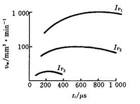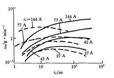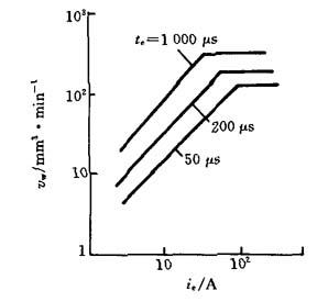 图3-3 脉冲放电电流对电火花成型加工速度的影响 加工条件:工具电极材料—紫铜;工件材料—CrWMn;vw—加工速度(mm3/min);ie—脉冲放电电流(A);te—脉冲放电时间(μs)