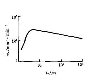 图3-4 单个脉冲能量不变的情况下,脉冲间隔对电火花成型加工速度的影响 加工条件:工具电极材料—紫铜;工件材料—T8A;加工极性—负(工件);vw—加工速度(mm3/min);t0—脉冲间隔(μs) (3)脉宽 脉冲宽度(或脉宽)对加工速度有很大的影响.在峰值电流不变的情况下,当脉冲宽度由小增大时,有一个获得最高加工速度的最佳脉宽.增大峰值电流,最佳脉宽也相应增大,脉宽太校加工速度会下降,这是因为气态蚀除的比例增大,耗损在汽化潜热上的能量增大;脉宽太大,加工速度也会下降,这是因为脉宽愈大,扩散掉的能量愈多,脉冲宽度对加工速度的影响,如图3-5所示.