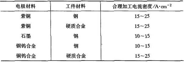 图3-6 加工极性对加工速度的影响 实线:电极材料—紫铜;工件材料—45#钢;加工极性—负.虚线:电极材料—紫铜;工件材料—45#钢;加工极性—正、vw—实际加工时的平均加工速度(g/min);te—脉冲放电时间(μs) (5)加工电流平均密度 电火花加工的加工电流平均密度在合理的范围内,对电火花成型加工速度没有明显的影响;但是当电流平均密度过大时,则会造成排屑条件恶化,甚至由于能量的过分集中,产生的气体过多,排斥液体介质,形成气体介质放电,这都是造成加工不稳定和降低加工速度的原因,因此,在一般情况下,电流密度不可过大,通常: Jm≤33A/cm2 式中:Jm——电流平均密度,Jm=I/S; I——加工电流(A); S——有效放电面积(cm2). 但是,对不同的工件材料和不同的电极材料,加工电流平均密度的范围不能一概而论.在电火花成型加工的实用过程中,加工电流平均密度值的选取和确定,应以电流密度最大值的50%为最佳值,表3-1是几种电极对的理想平均加工电流密度. 表3-1 几种电极对的合理加工电流密度