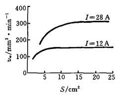 (6)工具电极材料和工件材料的性能 在相同的加工条件下加工相同的工件材料,采用不同材料的工具电极,可获得不同的电火花成型加工速度,在相同的加工条件下采用相同的工具电极材料,对不同的工件材料进行电火花成型加工,亦可获得不同的加工速度.这就说明工具电极材料可以影响电火花成型加工速度,同时,加工速度与工件材料的性能(熔点、沸点、导热系数、热容量、熔解和汽化的潜热等)有关,但是不受它的硬度、强度等性能的影响.工件材料的熔点和沸点愈高,热容量、熔化和汽化潜热愈大,加工速度就愈低.导电性能好,一般不利于加工速度的提高,材料的组织结构对加工速度也有一定的影响.一般说来,工具和工件这一电极对是否能稳定地实行电火花成型加工,是一个影响加工速度的重要因素.在实用过程中,较为理想的电极对有石墨—钢、紫铜—钢和紫铜—硬质合金等. (7)面积效应 当加工电流一定时,面积过小会导致加工速度的降低,如图3-7.这是因为加工电流密度过大时,脉冲放电过分集中,致使电极间气泡及蚀除产物排除不畅.改善排屑条件有利于增大加工电流密度,提高加工速度.
