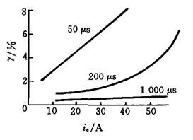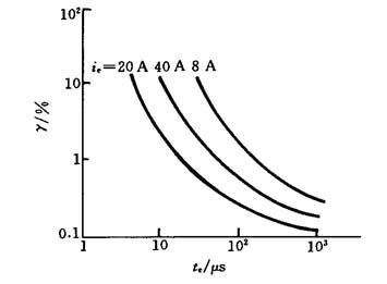 图3-8 脉冲放电时间对电火花成型加工工具电极相对损耗的影响 加工条件:电极材料—ф40mm紫铜棒;工件材料—CrWMn;加工极性—负(工件) (3)放电电流 为了实现低相对损耗的电火花成型加工,必须使脉冲放电电流和脉冲放电时间相适应,见图3-9.从图中可以看出,在各种脉冲放电时间的条件下,脉冲放电电流达到相当大的某值后就不能获得低损耗.同时还可以看出,随脉冲放电时间的加大,低损耗的条件允许放电电流值也随之适当加大.