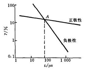 图3-11 加工极性对工具电极损耗率的影响 加工条件:脉冲峰值电流—48A;加工面积—10cm2 |