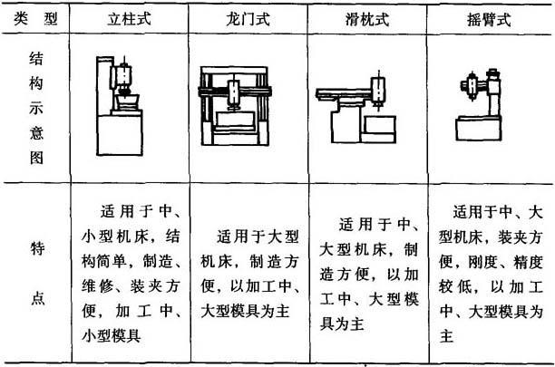 (1)成型加工机床的组成 机床主要由床身、立柱、主轴头、工作台及油箱等组成,按机床的布局和结构可以分为四大类,见表3-3. 表3-3 电火花成型加工机床的主要类型