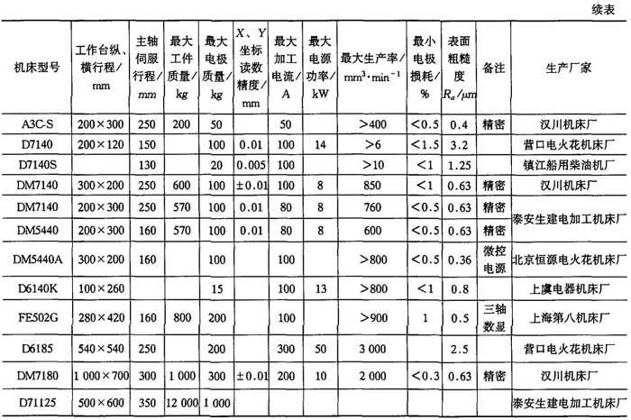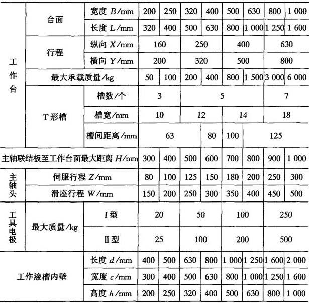 (2)成型加工机床夹具和附件 机床应配备相应的专用夹具和附件.成型穿孔机床可配备用于改善排屑条件的冲油或抽油油杯,修光型腔侧面和底面的二度或三度平动头,磨削内孔的专用夹具等. (3)成型加工机床主要参数标准 见表3-4. 表3-4 电火花穿孔、成型加工机床主要参数标准(GB5290—85)